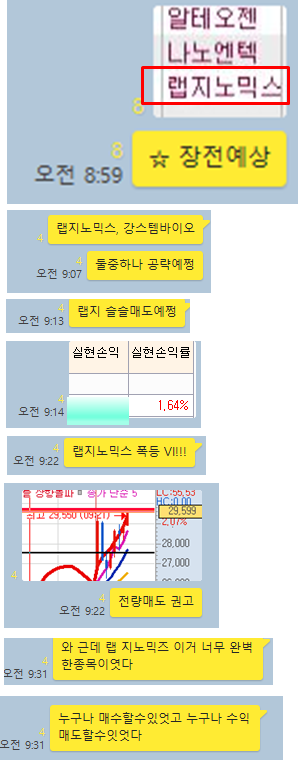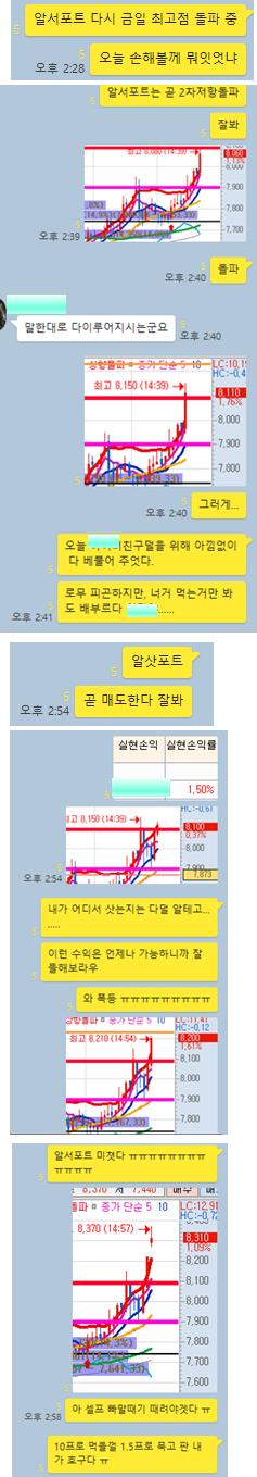 알서포트 3분봉 입니다. 오후 2시 이후에 발굴 및 공략한 종목으로 거래량 급증과 함께 주가가 오늘 최고점을 뚫고 있는 상황이였으며, 눌림목매매를 한다고 했을때 항상 매수하는 그 타점에서 매수시에 10%이상의 수익를 실현할 수 있는 구간이 있었습니다. 카톡장면은 10프로 이상 수익낼껄 1.5% 만 수익낸 것을 자책하는 장면입니다.