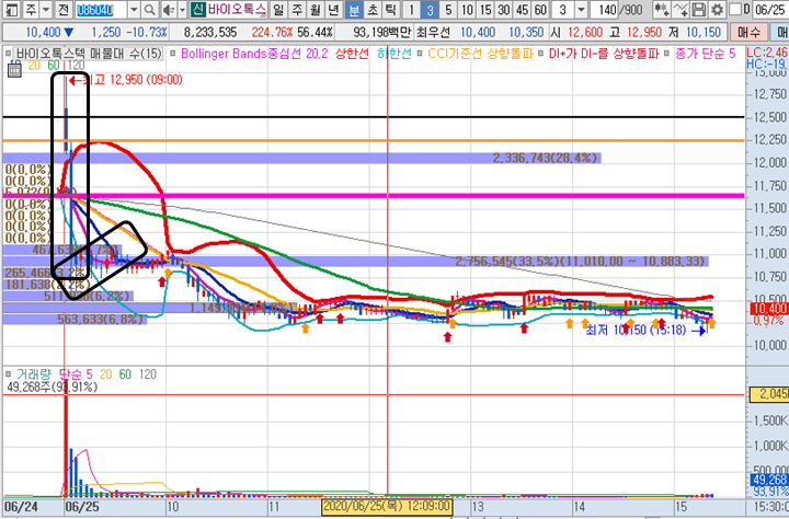 바이오톡스텍 3분봉 입니다. 어제 상한가에 진입한 종목으로 시초가에는 갭상승을 띄우면서 강력한 것 처럼 보였습니다.