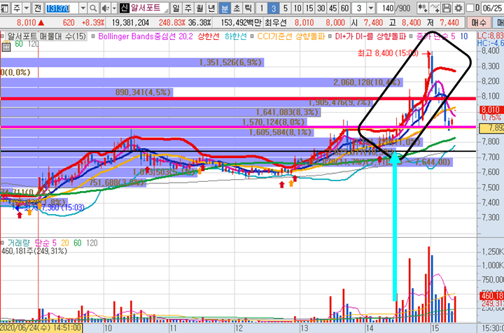알서포트 일봉차트 입니다. 정말 완벽한 일봉차트에서 드라마틱한 상승이 나왔습니다. 제가 제일좋아하는 일봉모습입니다. 무조건 상승이 나오는 마법의 차트형태입니다. 잘 기억해두세요.