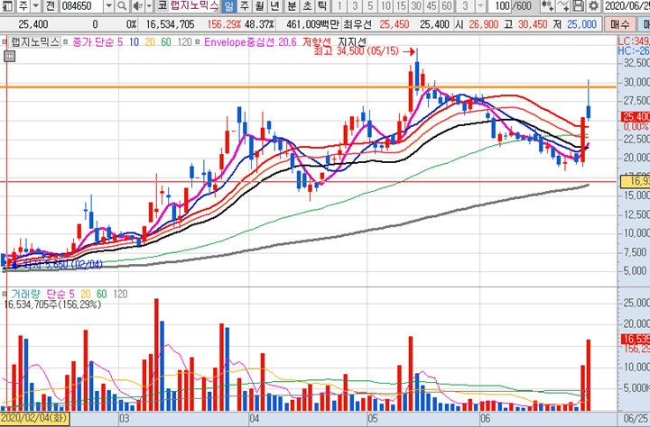 랩지노믹스 일봉차트 입니다. 긴 윗꼬리가 달린 음봉으로 마감했습니다. 거래량은 꾸준히 붙어있는데 상한가 진입후 몇일간 쉬어가는 수도 있습니다.