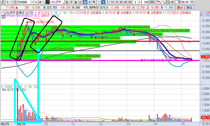 신일제약 3분봉 입니다. 이 종목은 장전 예상종목으로 선별한 종목으로 시초가에 상승으로 출발하여 피봇1차저항을 돌파하고 전일고점까지 돌파한다음에 다시 하락으로 무너진 종목입니다. 제가 장전 예상한 종목이 시초가 부근에 시가로 담았다면 13350원 이였을 것 이고 전일고점 부근에 ALL 매도로 대응했다면 15700원에 17.6%의 수익구간이 나온 종목입니다.