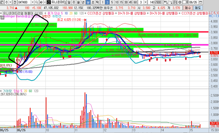 유니온머티리얼 일봉차트 입니다. 최근에 많이 매매한 종목으로 매매할 때 마다 거의 높은 확률로 수익을 실현할 수 있었던 종목이며, 항상 큰 수익이였던 것으로 기억합니다. 이렇게 최근 이슈종목에 대해서 꾸준히 연구하다 보면 이렇게 하루에 매매하는 종목이 중복되는 경우가 많습니다. 나에게 한번 수익을 준종목은 계속해서 수익을 주게 되어 있습니다. 부디 쫄지 말고 과감하게 매수하시되 단, 타점에서만 매수하기면 손절보다는 수익 확률이 월등히 높습니다.