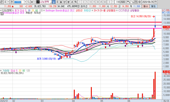과거 이종목은 무료리딩방에서 6000원대에 매수를 지켰지만 3000원까지 하락하면서 한달안에 반토막이 나며 많은 개인투자자들이 눈물을 머금고 손절 했다는 소식을 들었는데 요즘 상황을 보면 최저점인 3040원 대비하여 5배가까이 폭등한 대박 종목이 아닐 수 없습니다. 이 종목은 7월2일 상장을 앞두고 있는 전국민의 최대의 관심 종목 SK바이오팜으로 인해 관심을 받는 것으로 보이는데 그룹 계열사로 알려진 나노엔텍에 까지 자금이 몰리면서 큰 거래량과 함께 주가가 지속적인 상승이 나오고 있는 상태 입니다.