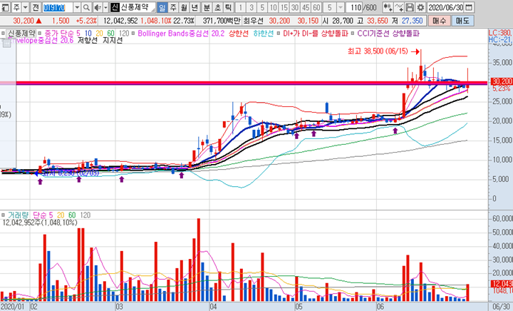 신풍제약 일봉차트 입니다. 신풍제약은 과거 많이 매매한 종목으로 그동안 이종목으로 인해 많은 돈을 벌었는데 오늘도 역시 거래량이 다시 들어온 상태의 매매타점에서는 항상 수익을 안겨준 고마운 종목입니다.