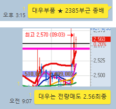 대우부품 3분봉 입니다. 전일 오후에 공략을 한 종목으로 종가배팅까지 결심을 하게된 종목입니다. 종가배팅 가격을 2385원으로 제시하였으며, 일단 시초가부터 1%의 상승으로 출발하였으며 분봉 하나를 더보고 긴 양봉이 나왔을 때 2.56%수익으로 최종 마무리한 성공한 종배 종목입니다.