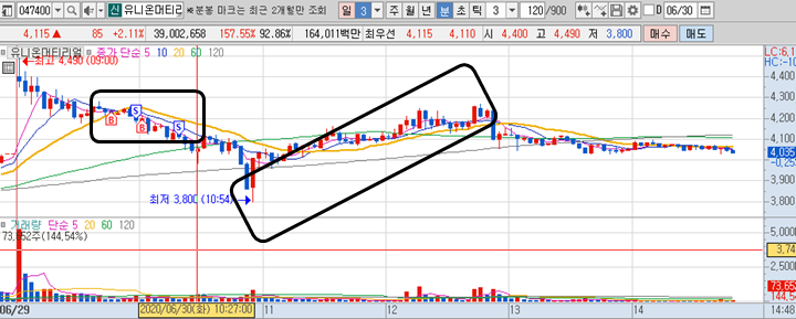 유니온머티리얼 3분봉 입니다. 이 종목은 장전예상종목으로도 선정하였지만 시초가에도 동일하게 선정하여 오늘 단하나의 공략종목으로 결정했습니다. 그러나 시초가 가격이 워낙 높게 형성이 되어있어서 시초가 돌파는 커녕 지속적으로 하락만 나왔습니다. 그래도 10일선과 20일선에서 각각 매수시에 수익을 주는 구간이 있었으며, 황금선 지지하는 것을 확인하고 10시가 다 된 시간에 보수적으로 대응을 해보았는데, 처음 약수익을 실현하고 그 다음에 한번 더 들어갔지만 차트가 무너지는 상황이라 대피를 한 종목입니다. 그 이후에 완전 급락이 나왔는데, 어제 공략종목인 씨에스베어링 드라마틱한 반전이 생각나서 계속 지켜보던중 11시경 최저점 대비 12%이상의 상승 구간이 다시 나왔었습니다. 제가 분석하기에 그 최저점은 5분봉 차트에서 보면 120선 부근입니다. 120선을 크게 무너뜨리지 않고 지켰기때문에 지속적인 상승이 나왔고 그 상승구간이 무려 12%이상이 되었던 것 입니다.